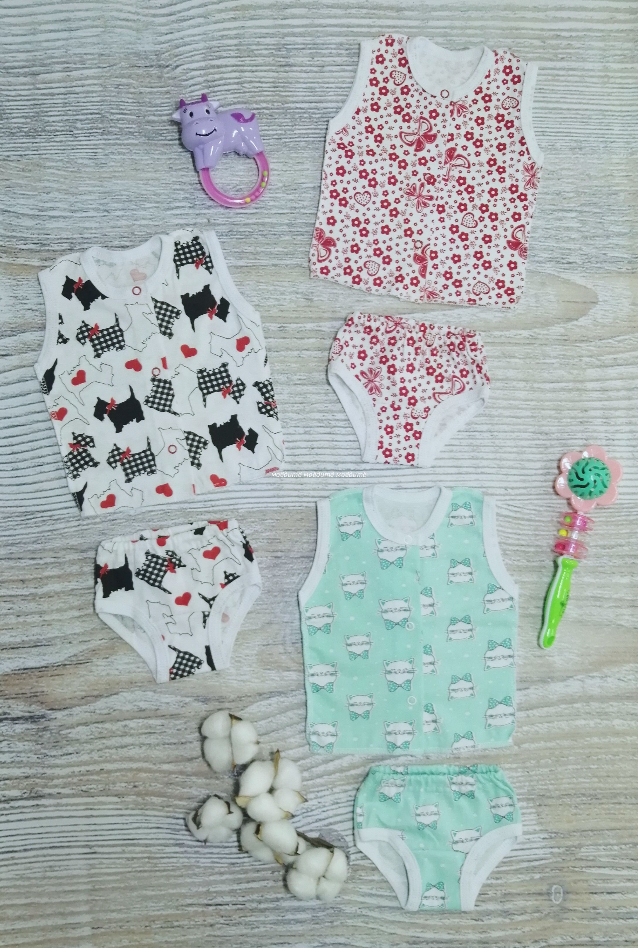 Комплект состоит из кофточки без рукавов, спереди на кнопочках и трусиков.